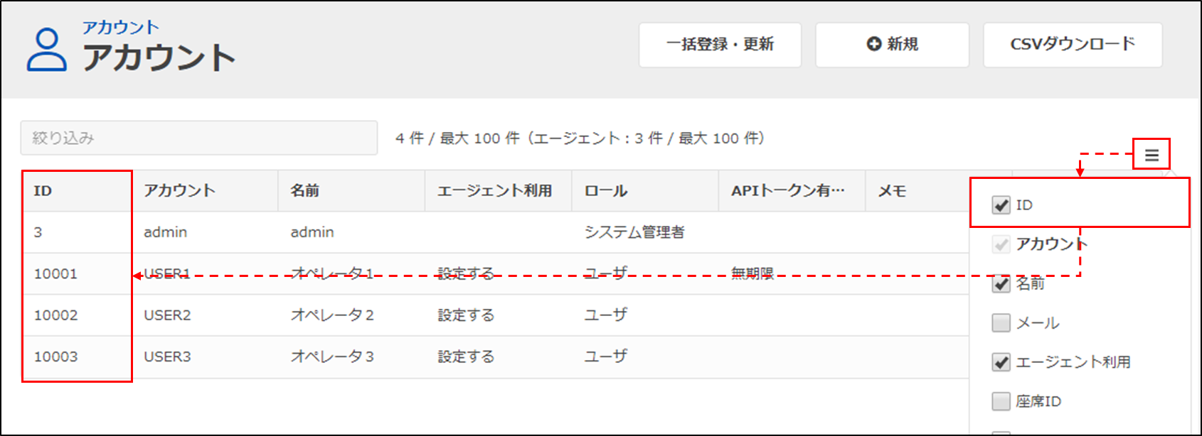 各メニューのIDは、BIZTEL管理画面のハンバーガーメニューから非表示となっているIDの項目にチェックを入れ、ご確認ください。