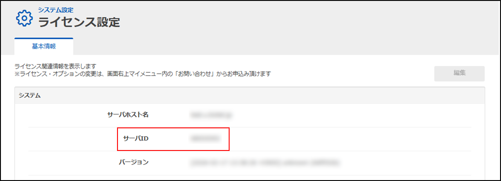 BIZTEL バージョン3.13.10 以降、管理画面 [システム設定] > [ライセンス設定] > [システム] に [サーバID] が表示されます。