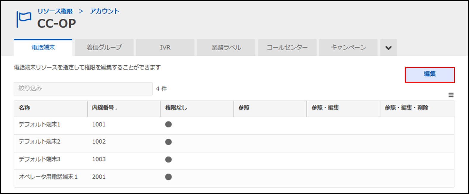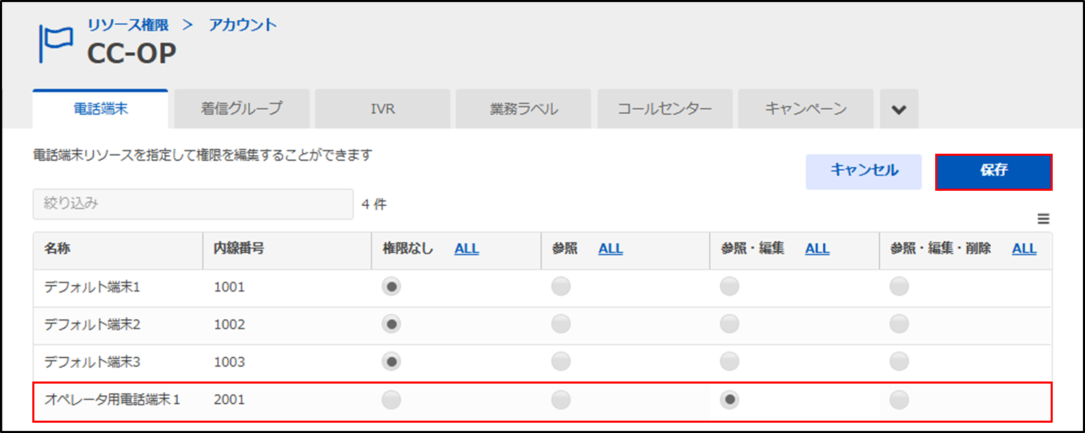 手順5.内線番号の権限を変更します。