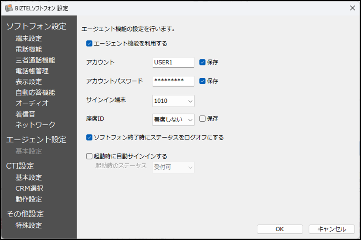 ソフトフォン [設定] ボタン(または歯車アイコン) > [エージェント設定] > [基本設定] > [エージェント機能を利用する] にチェックを入れ、アカウントやパスワードなどを設定します。