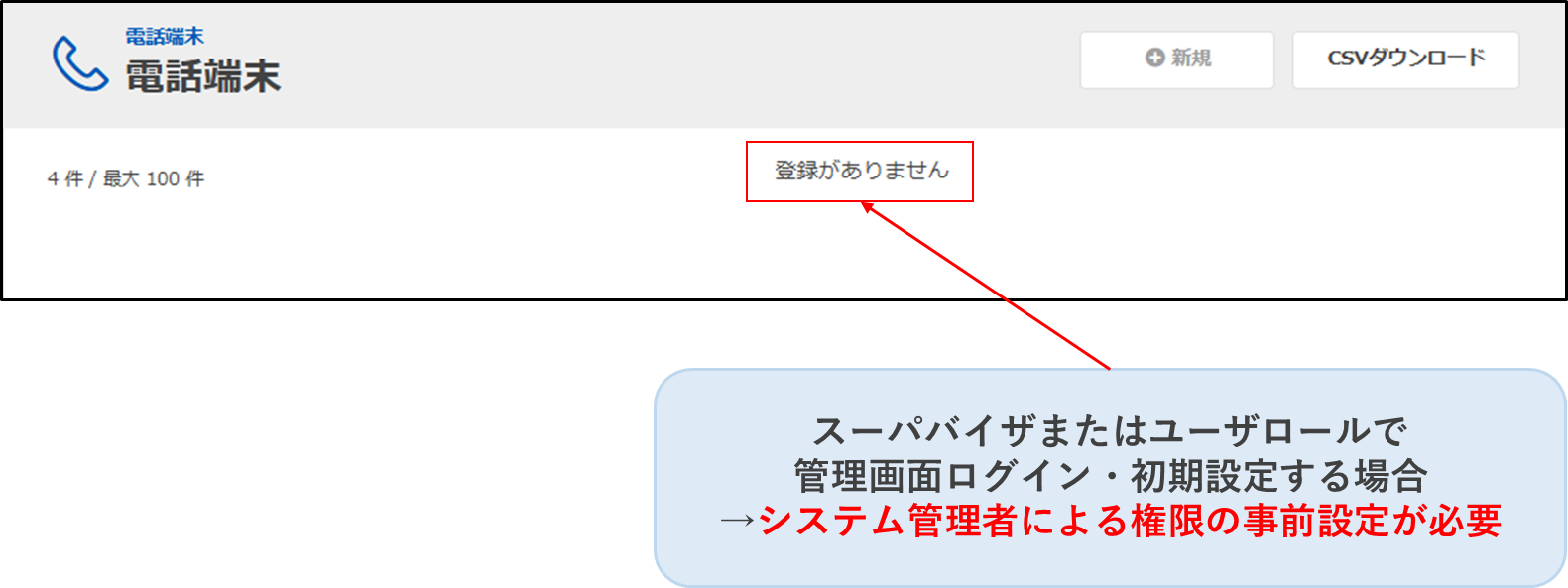 本設定が行えていないと管理画面に電話端末の情報が表示されず、初期設定が行えません。