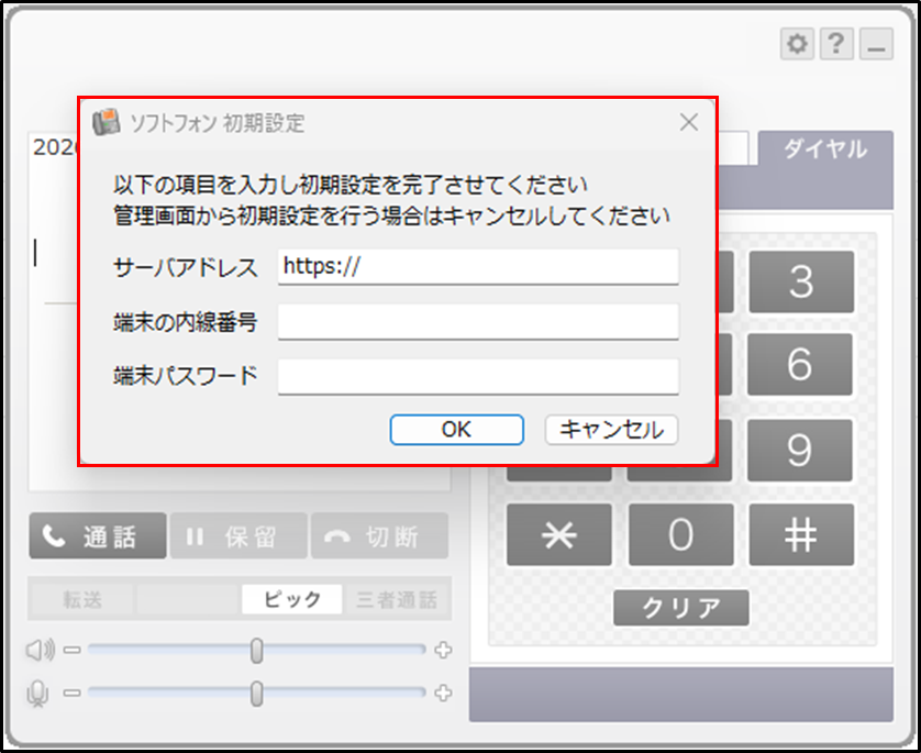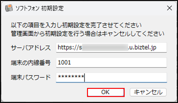 手順1.ソフトフォンを起動すると [ソフトフォン 初期設定] のポップアップが表示されるので、設定情報を入力します。