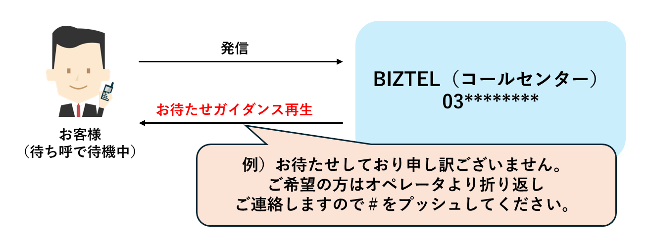 本設定は待ち呼の状態から「#をプッシュして折り返し呼として登録する」流れになりますので、待ち呼中に「#をプッシュすることで担当から折り返しすることが可能である」旨をアナウンスする必要があります。