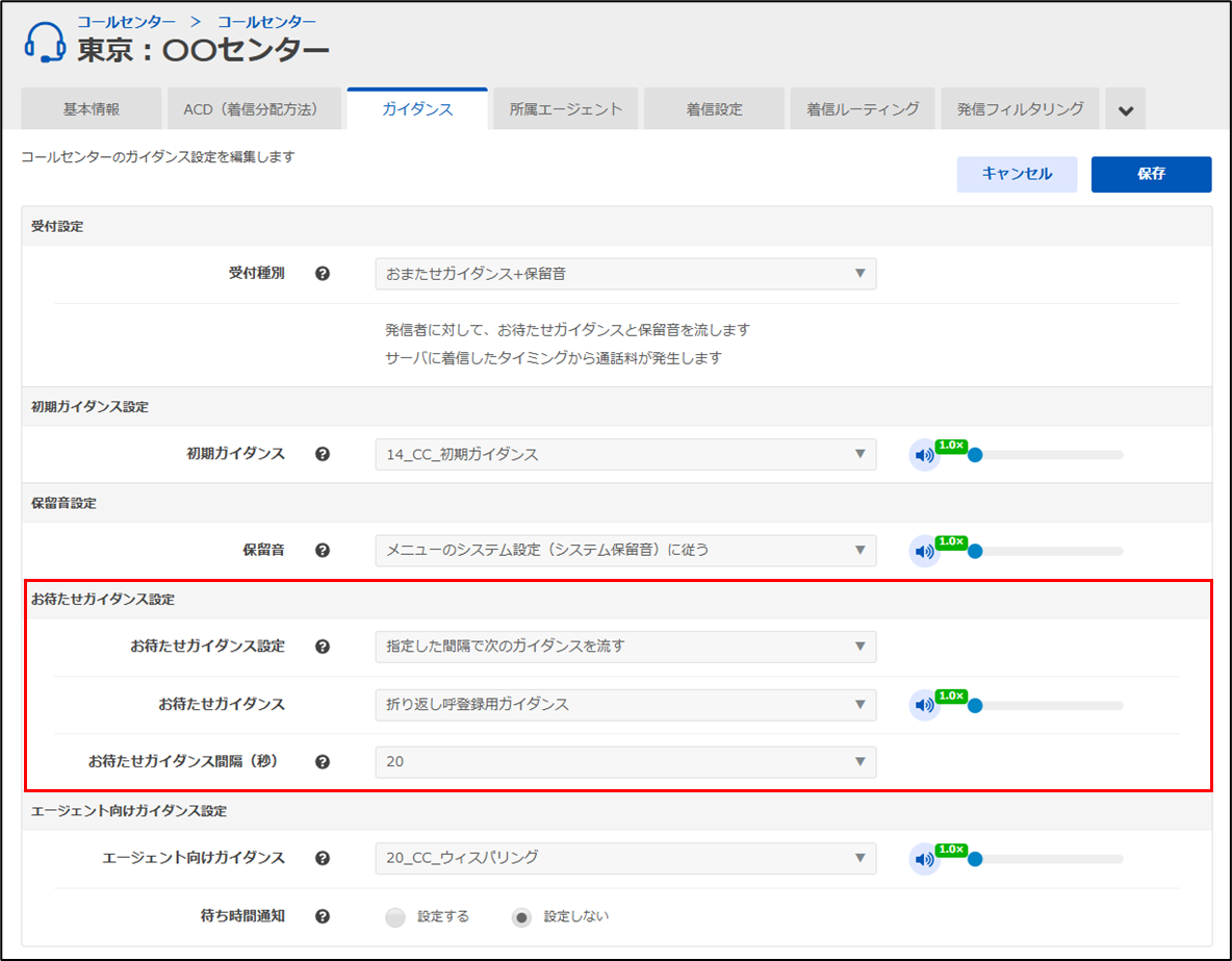 | お待たせガイダンス設定 | 「指定した間隔で次のガイダンスを流す」を選択します。 |