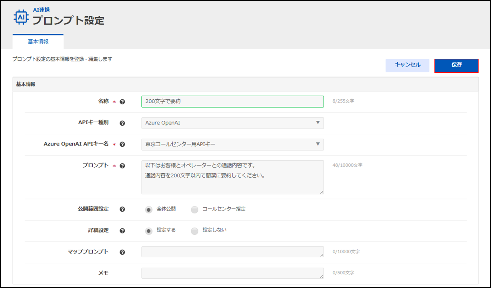 BIZTEL管理画面の「AI連携」>「プロンプト設定」を設定します。 |