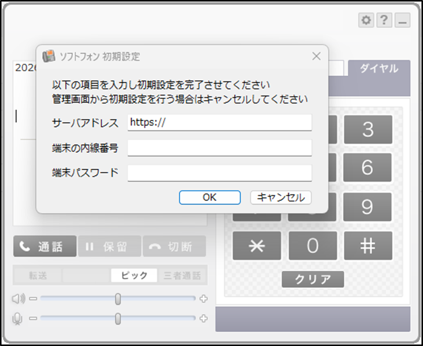インストール完了後、「ソフトフォン 初期設定」のポップアップが表示されます。