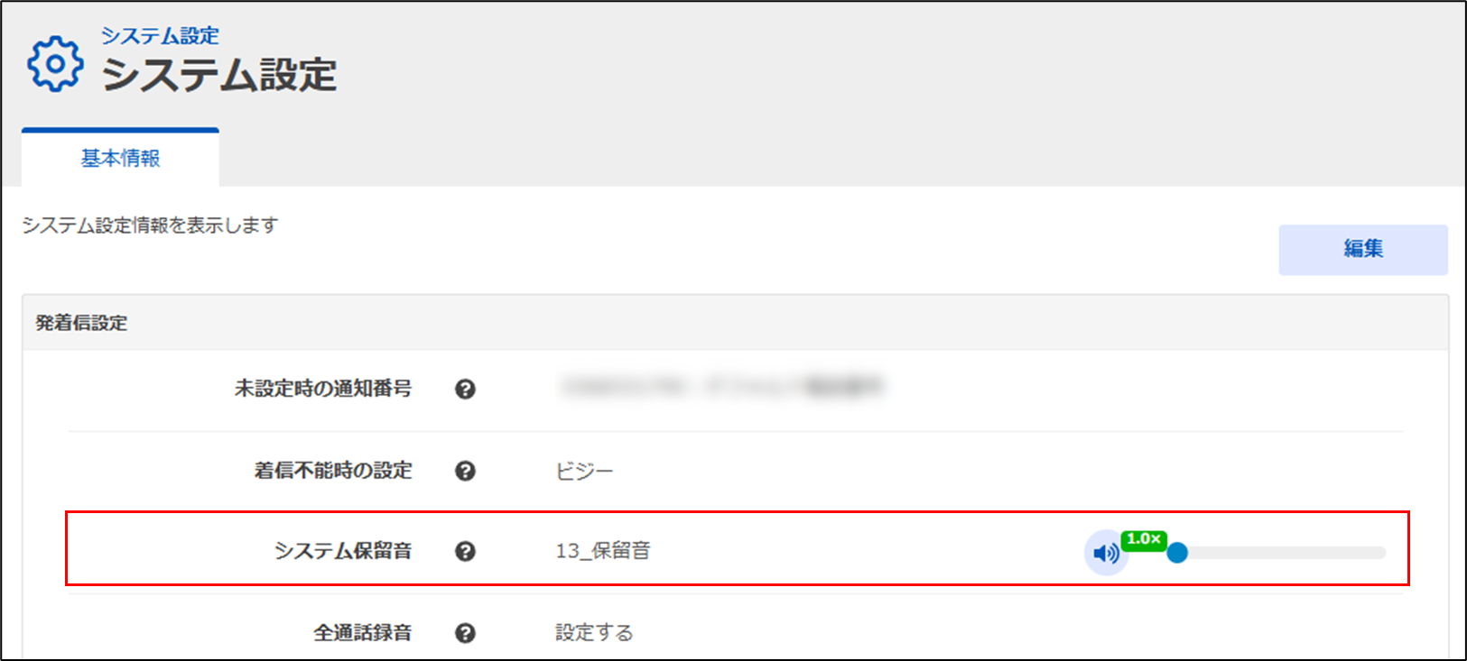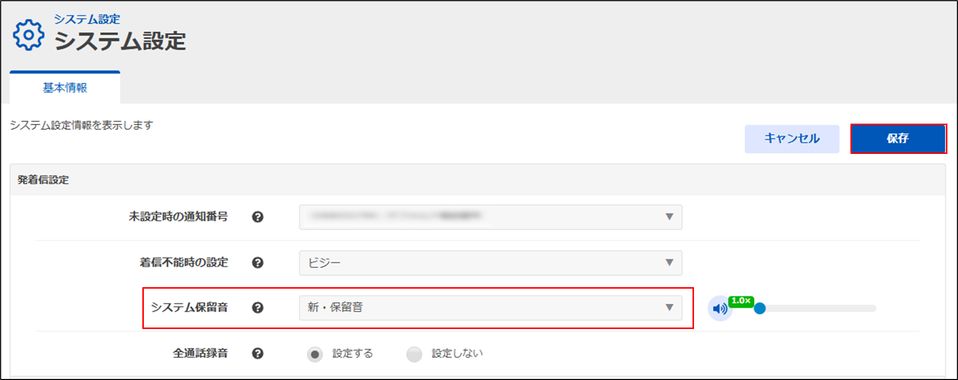 手順3.システム保留音を「2.2 共通ガイダンスへの音源登録」で登録した音源を選択して保存します