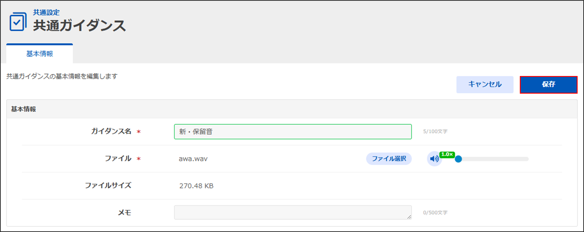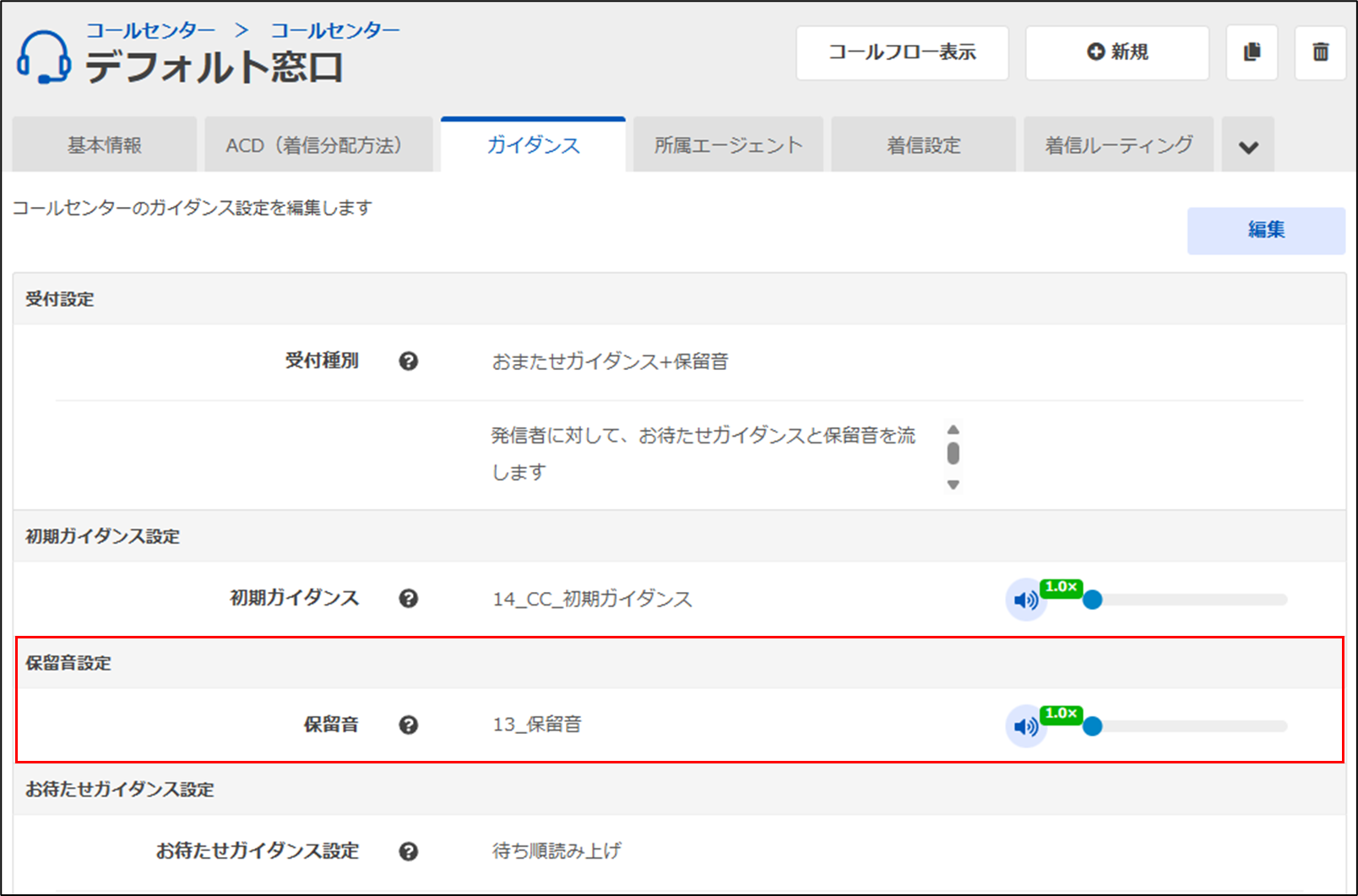 参照箇所:コールセンター > コールセンター > 内線番号クリック > ガイダンスタブ > 保留音設定