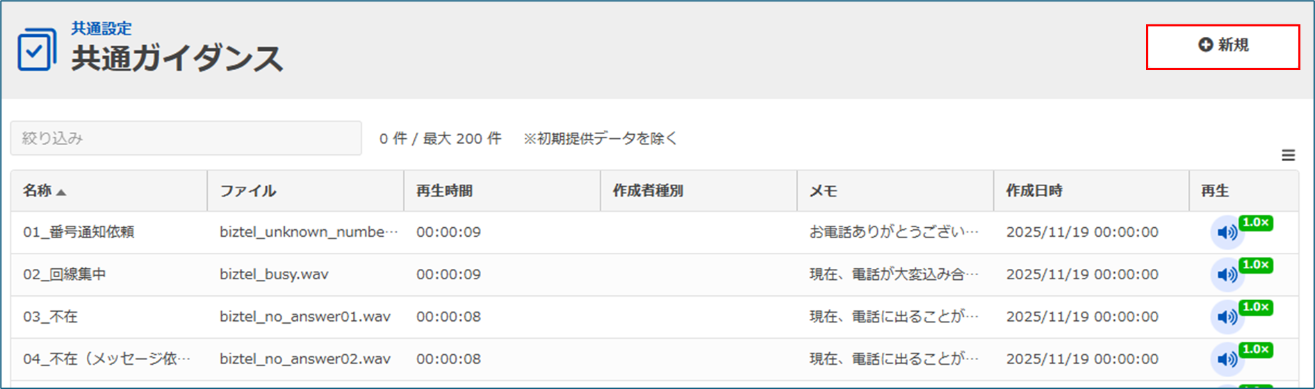 システム設定やコールセンターで音源を利用するためには、まずBIZTEL上で「共通ガイダンス」に音源を登録する必要があります。