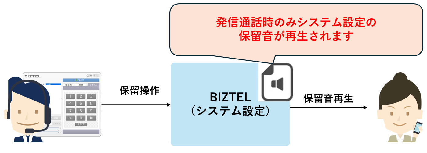 ・発信通話時については、コールセンターで設定した保留音は適用されず、システム設定の保留音が再生されます