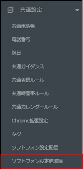 手順1.管理画面より「共通設定」 > 「ソフトフォン設定値取得」 をクリックします。