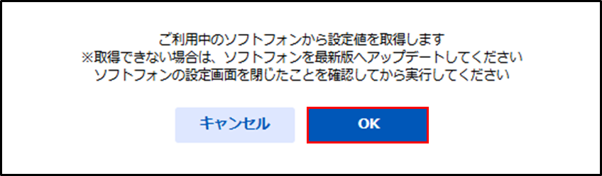 手順10.「ご利用中のソフトフォンから設定値を取得します」とメッセージが表示されるので、「OK」をクリックします。
