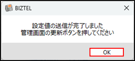 手順11.「設定値の送信が完了しました」と表示されるので、「OK」をクリックします。