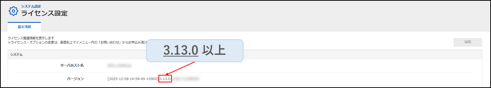 「システム設定」 > 「ライセンス設定」 > 「システム」 > 「バージョン」欄に、ご利用のバージョンが記載されています。