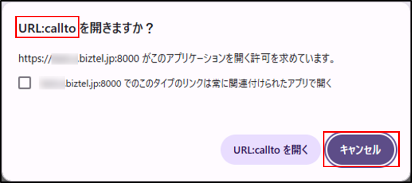 ※「URL:callto を開きますか?」とポップアップが表示される場合、同じPC上にソフトフォンがインストールされていないため設定値取得が行えません。