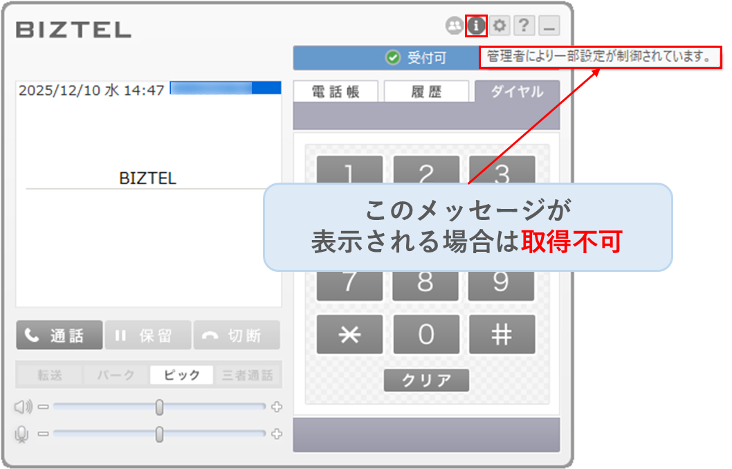 ソフトフォン右上のインフォメーションアイコンにカーソルを合わせ、「管理者により一部設定が制御されています。」のメッセージが表示される場合、ソフトフォン設定配信による制御が行われています。