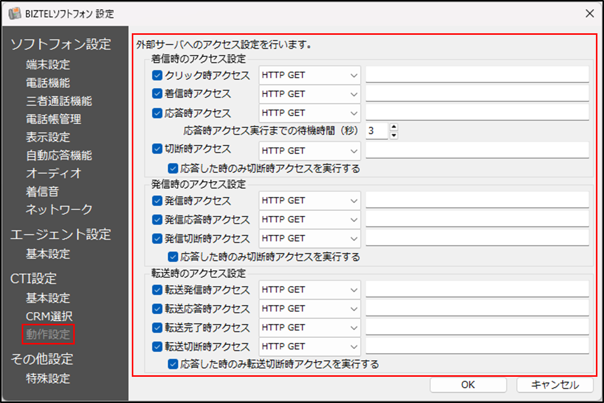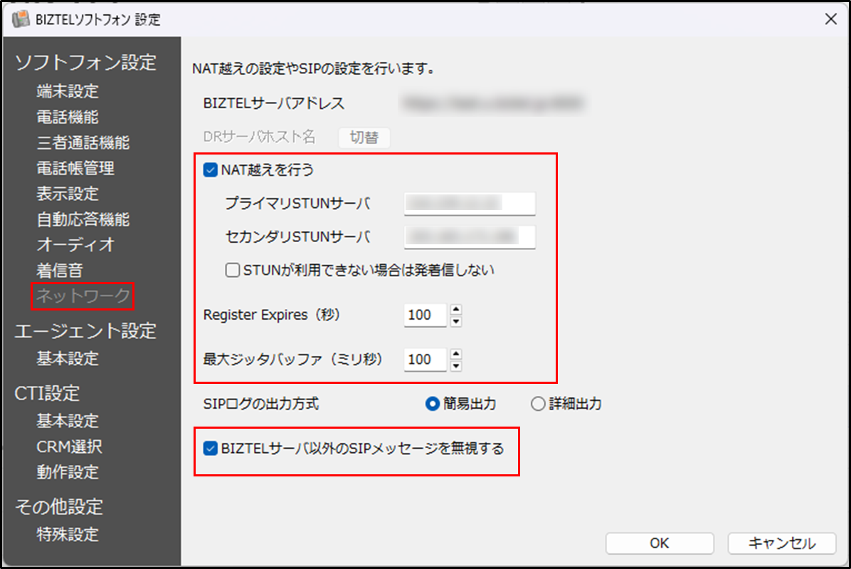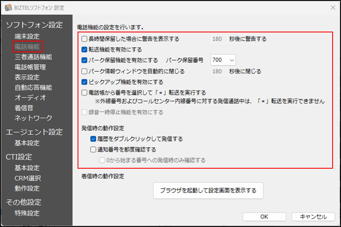 各設定の詳細は「2.「ソフトフォン」メニューの設定(BIZTELバージョン 3.3.X 以降」をご参照ください。