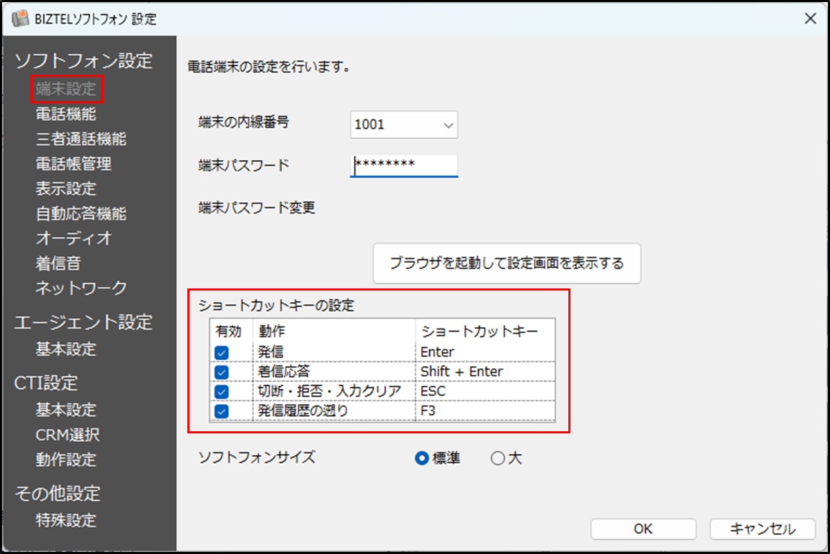ソフトフォン設定の詳細は、「2.「ソフトフォン」メニューの設定(BIZTELバージョン 3.3.X 以降)」をご参照ください。