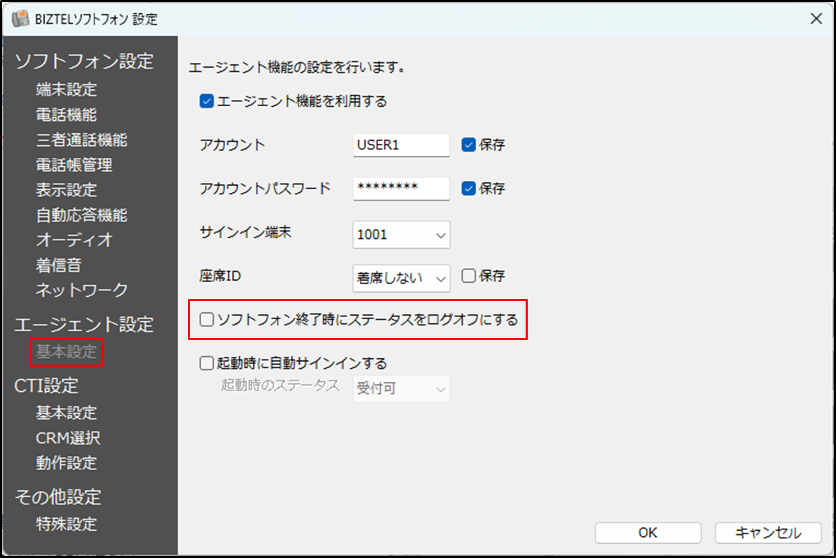 ・「基本設定」 > 「ソフトフォン終了時にステータスをログオフにする」のチェック有無
