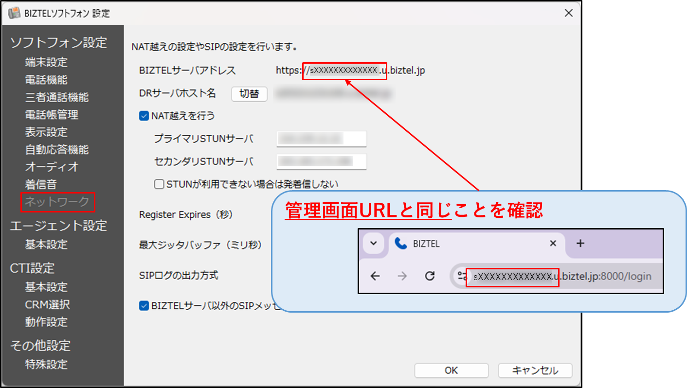 管理画面のURLと、ソフトフォン設定「ネットワーク」 > 「BIZTELサーバアドレス」のURLそれぞれに記載されている値が一致していることを必ず確認してください。