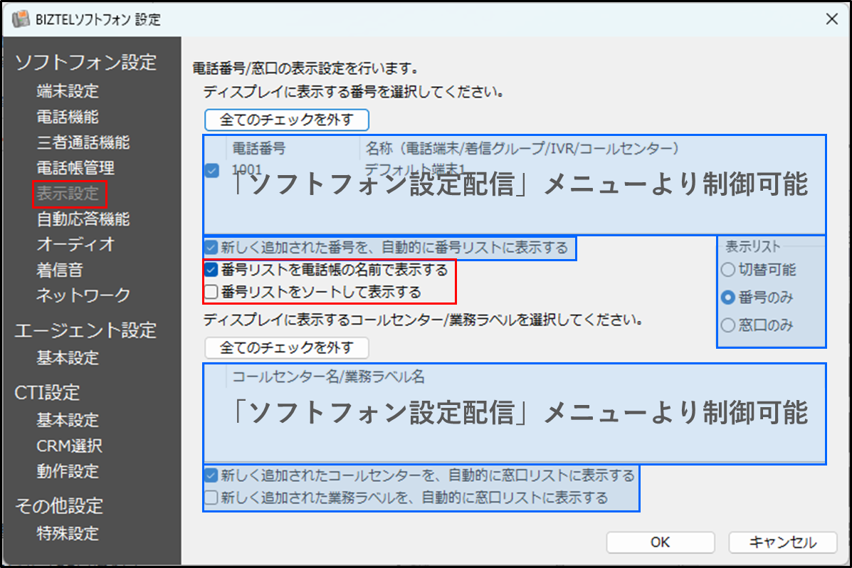 ※ソフトフォン上で表示対象とする番号・窓口リスト(以下画像青色の項目)は、管理画面「ソフトフォン配信設定」メニューで表示対象番号または窓口の選択・配信制御が可能です。