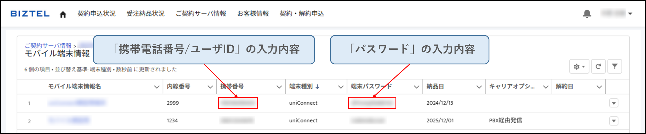 「モバイル端末情報」をクリック > 「携帯番号」「端末パスワード」に記載の値