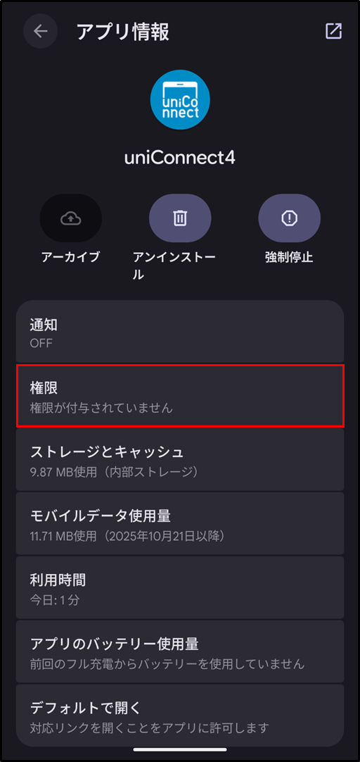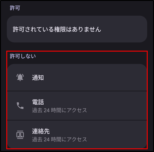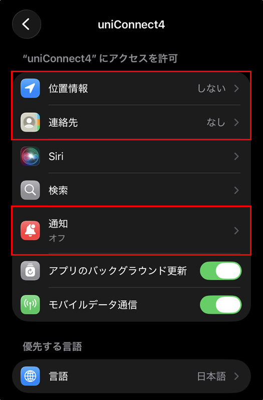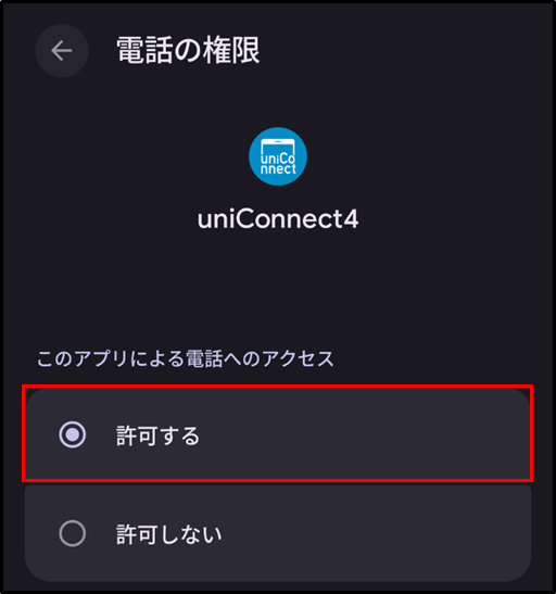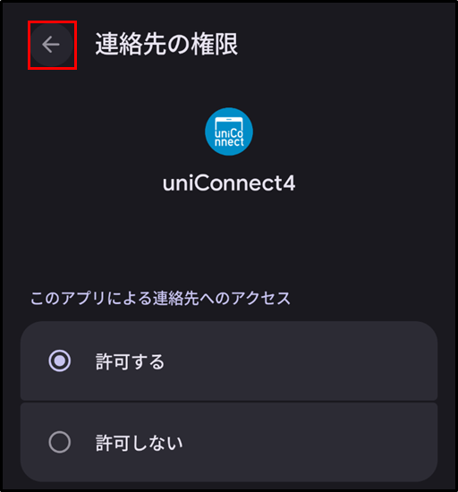 手順5.[許可しない] に [通知] [電話] [連絡先] のいずれかが表示されている場合は、uniConnectのご利用に必要なアクセス許可設定が行われていません。