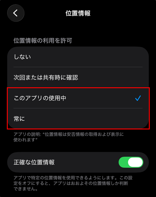 [このアプリの使用中] または [常に] をタップします。