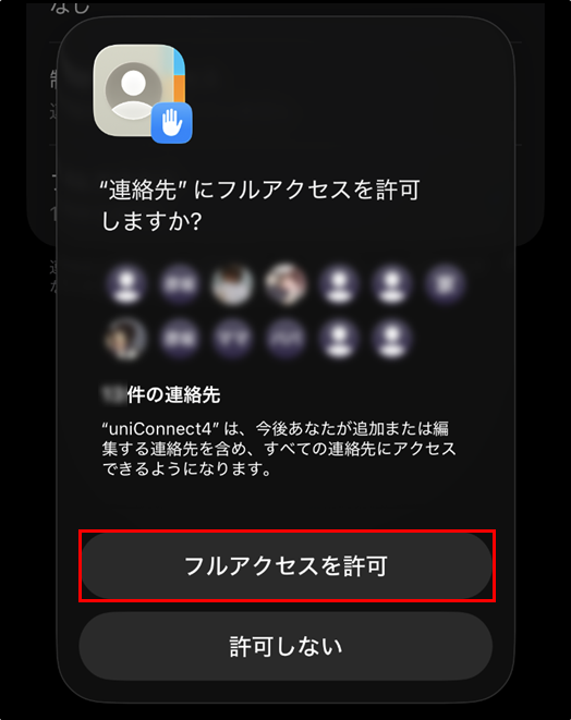 ・uniConnectをご利用いただくには、アプリに対し端末側で電話帳や通知機能などへのアクセス許可が必要となります。