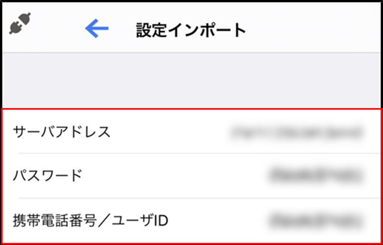 「設定インポート画面」に入力された「サーバアドレス」「パスワード」「携帯電話番号/ユーザID」の内容が誤っている場合、設定インポート時にエラーが発生します。