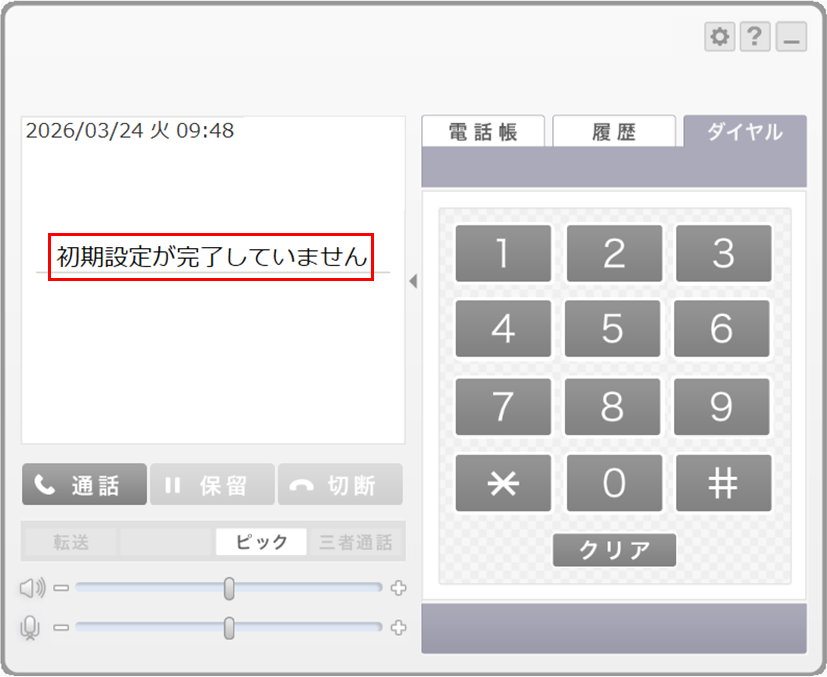 初期設定がされていないソフトフォンは、「初期設定が完了していません」と表示されます。