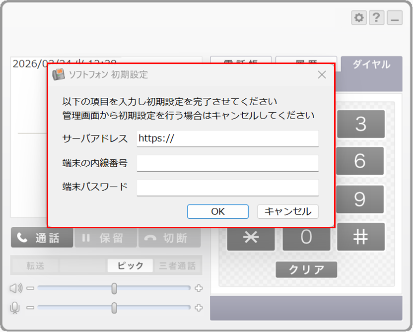 ソフトフォンインストール後にポップアップ表示される「ソフトフォン 初期設定」に必要情報を入力することで、管理画面にログインすることなくソフトフォンの初期設定を完了することが可能です。