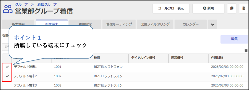 作成した着信グループに電話端末を所属させます。