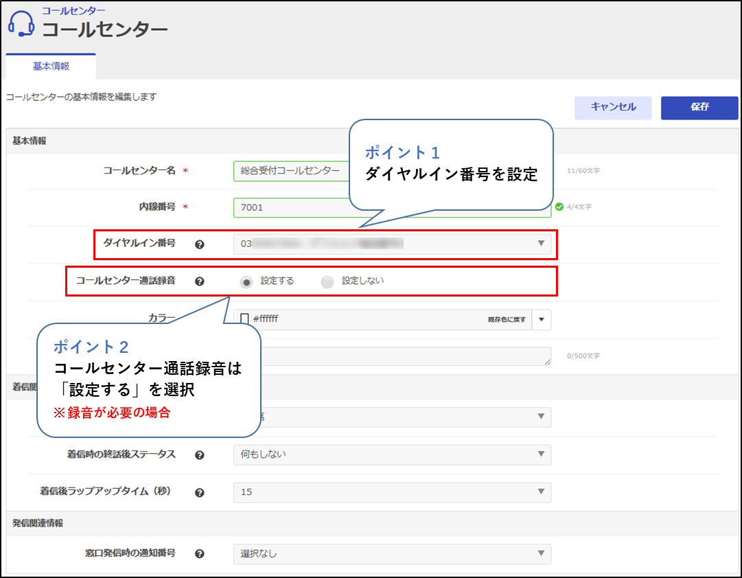 コールセンターの「ダイヤルイン番号」として、利用する外線番号を選択します。