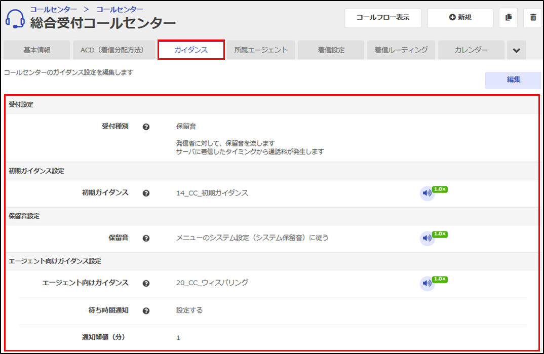 「ACD(着信分配方法)設定」でエージェントを呼び出すルールを設定し、コールセンターの「ガイダンス設定」では、発信者やエージェントへ流す自動音声が設定できます。