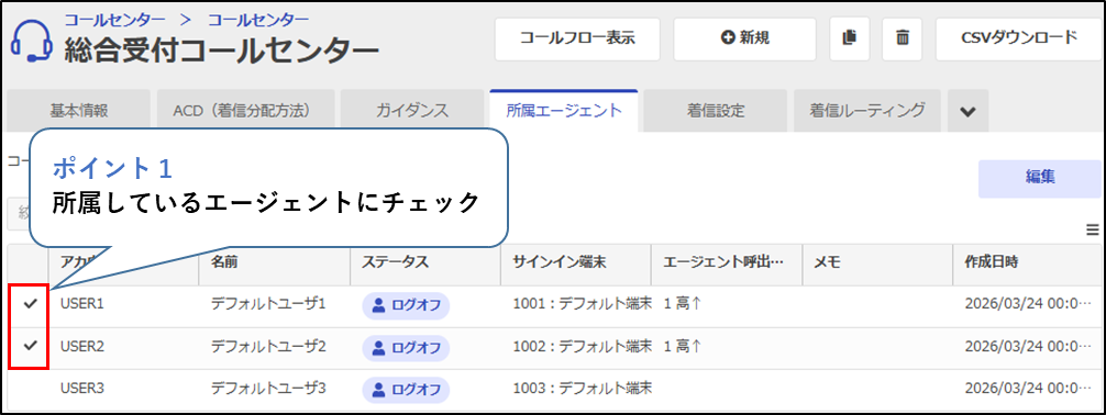 作成したコールセンターにエージェントを所属させます。