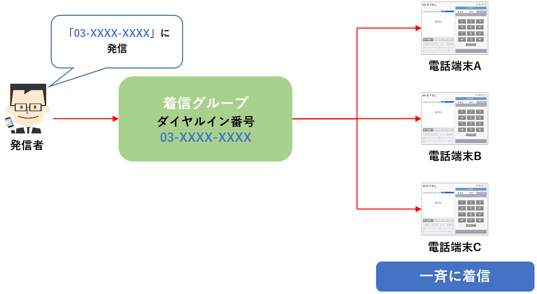 「着信グループ」は、着信時にグループに所属する全端末を一斉に呼び出し、最初に応答した端末が通話できる機能です。