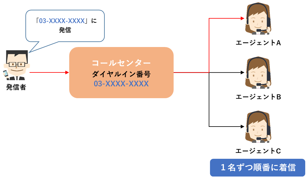 「コールセンター」は、着信時に設定したルール(ACD:着信分配)に従って、エージェントを1名ずつ順番に呼び出す機能です。