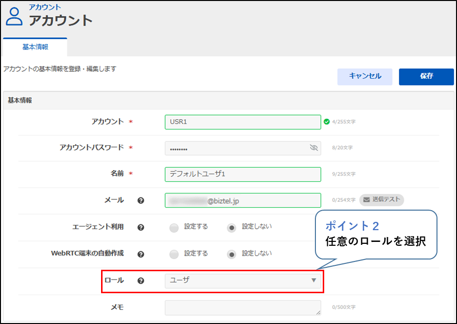 BIZTELに関する設定は行わず、電話端末での発着信のみを行うアカウントであれば「ユーザ」ロールを選択します。