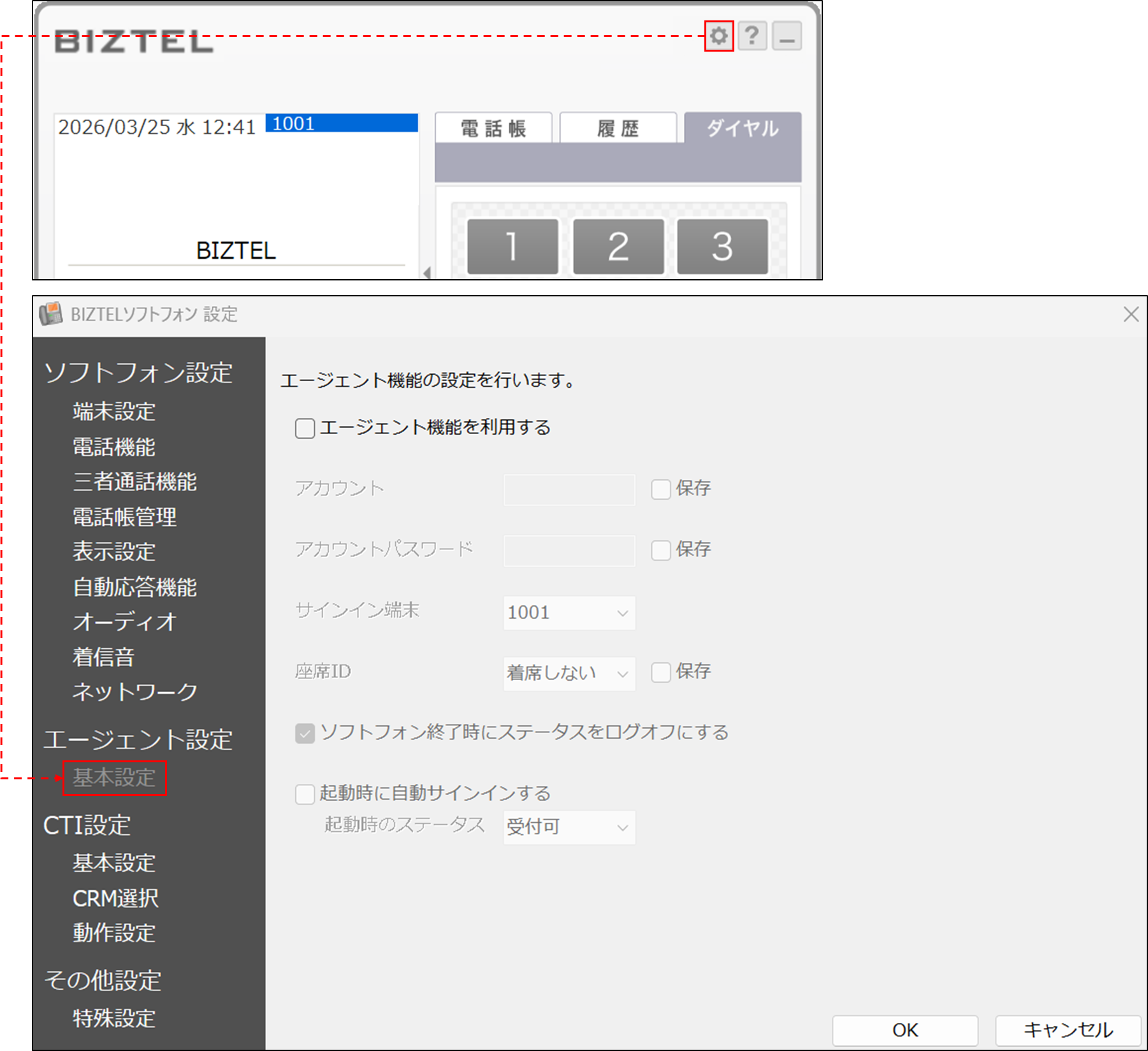 ソフトフォンの「エージェント設定」より、アカウント(エージェント)情報の紐づけを行います。