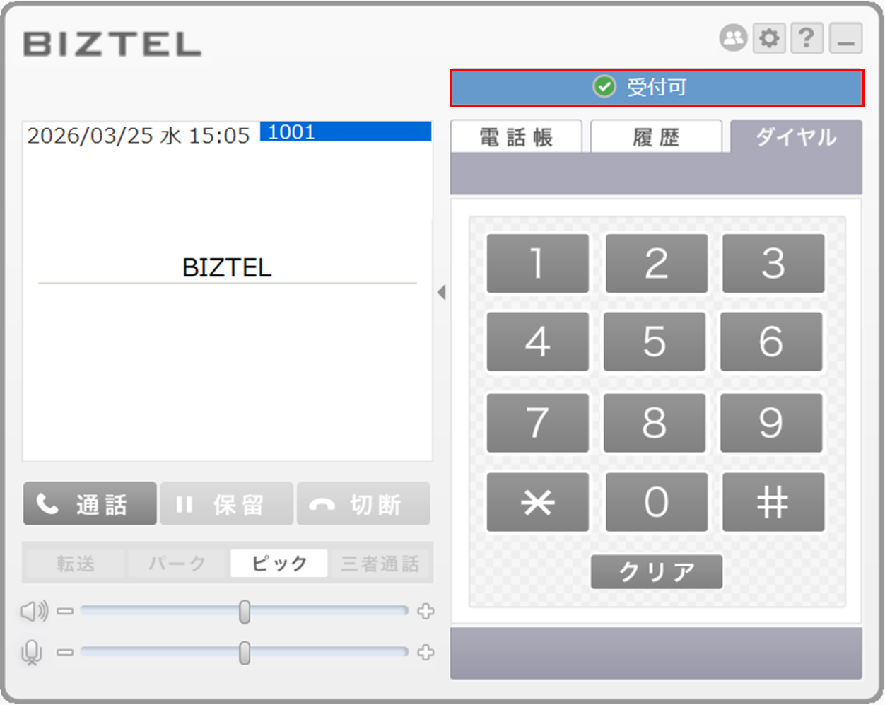 手順1.コールセンターに所属するアカウント(エージェント)を紐づけたソフトフォンを起動し、右上のステータスを「受付可」にします。