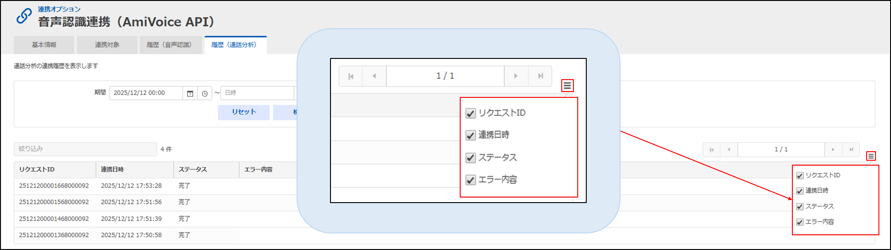 分析対象となる通話のリクエストIDが表示されます。 ※「リクエストID」とは、通話ごとに採番される20桁のユニークな文字列です。 |