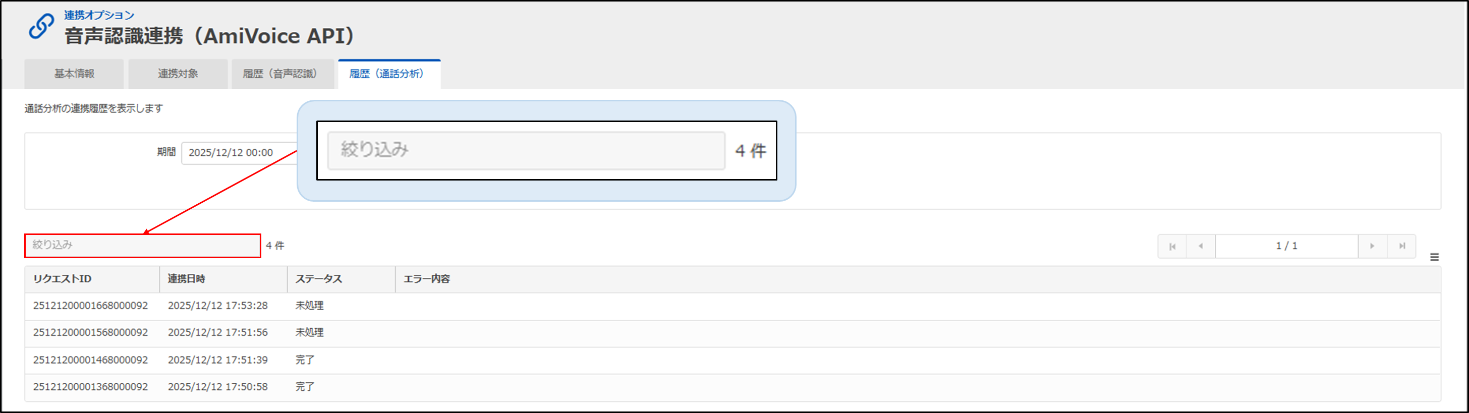 BIZTELバージョン 3.13.0 以降、各通話におけるAmiVoiceでの分析処理状況を「連携オプション」 > 「音声認識連携」 > 「履歴(通話分析)」タブから検索・参照可能です。