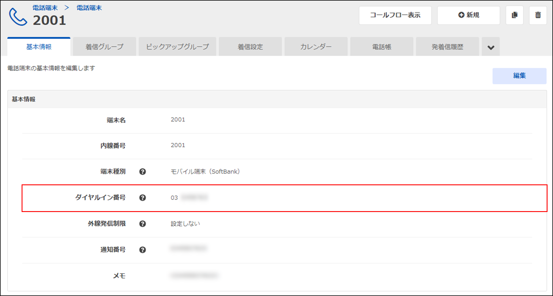 設定例)以下、図のようにモバイル端末自体にダイヤルイン番号が表示されている場合