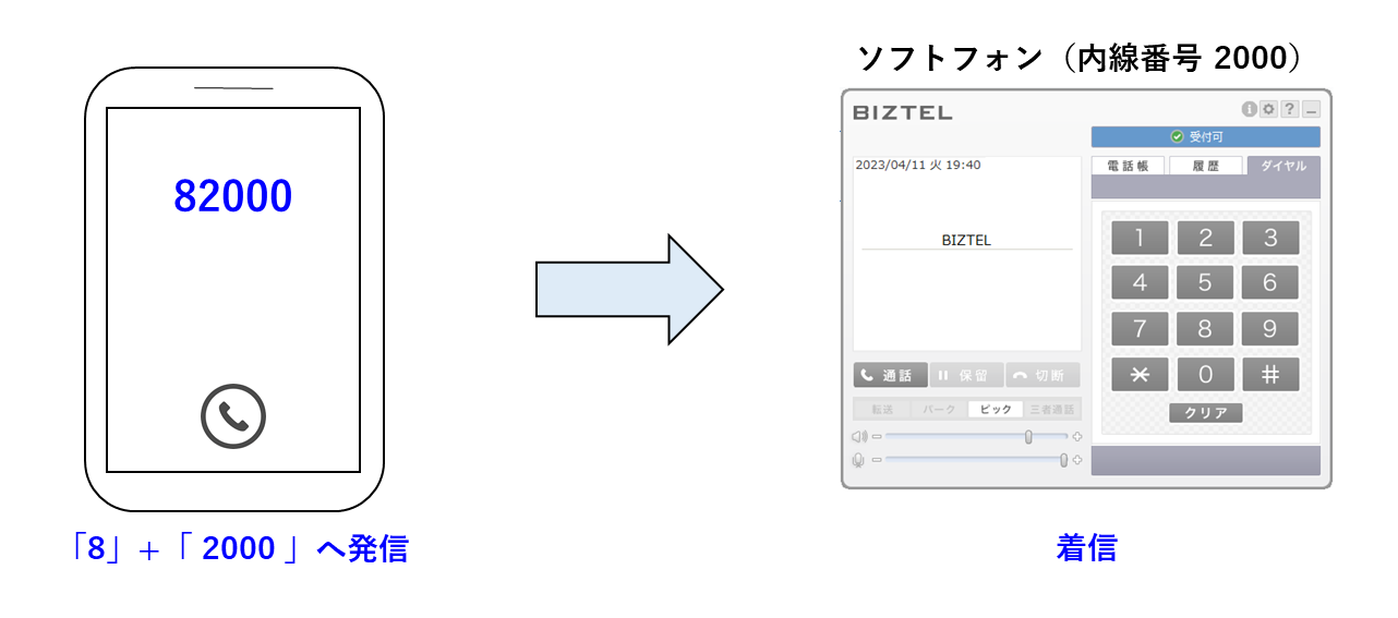 「 8 」+「 9 」+「 内線番号 」 + 発信ボタン ※BIZTELバージョン 3.4.10 以降、通話開始時にピーと通話開始音が再生されます。 |