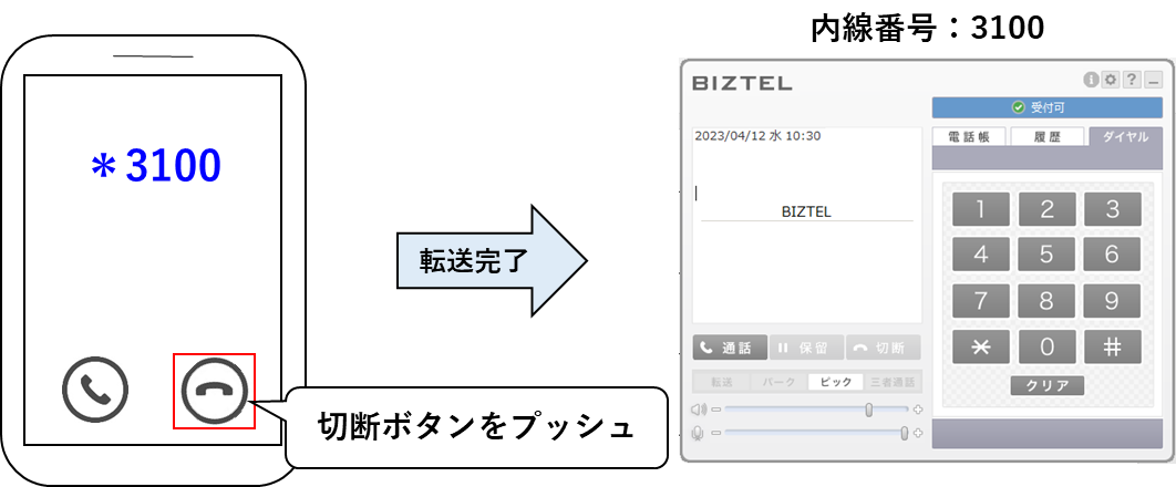 手順4.発信が完了すると、転送元のモバイルは通話が切断され、転送先に着信が入ります。