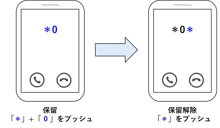 通話中に「*」+「 0 」をプッシュします。 保留解除する場合は、再度「*」をプッシュします。 ※「*」プッシュ後、「転送先の外線番号を入力してください」とガイダンスが再生されますが、そのまま「 0 」をプッシュします。 |