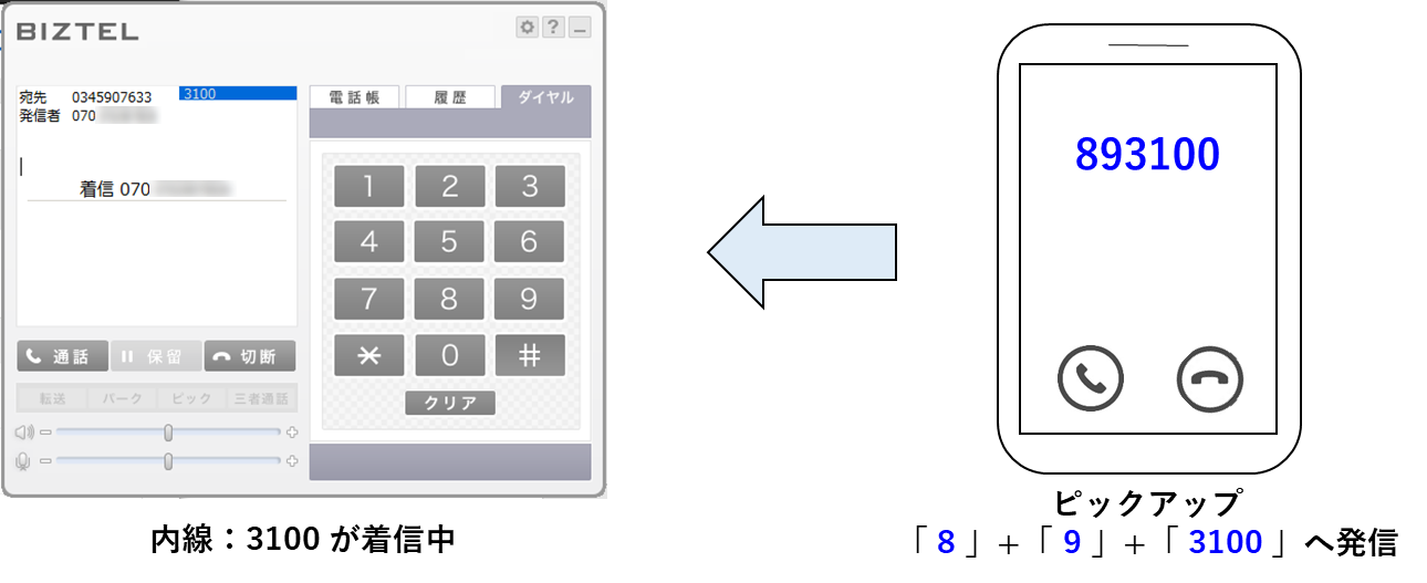 ※BIZTELバージョン3.11.0以降、「8+90000」に対して発信することでもピックアップ可能ですが、事前にピックアップグループの作成が必要となります。また、ピックアップ先の内線を指定することはできません。