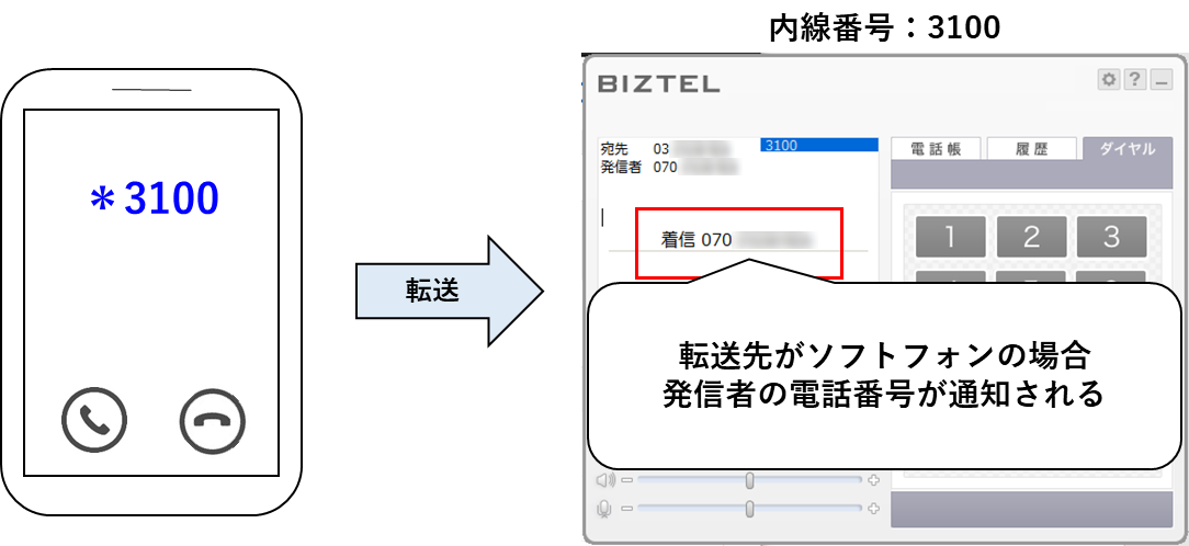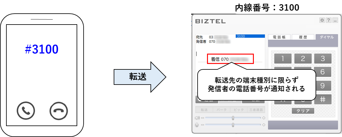 ※転送先には、発信者の電話番号が通知されて着信します。(転送先の端末種別は問いません)
