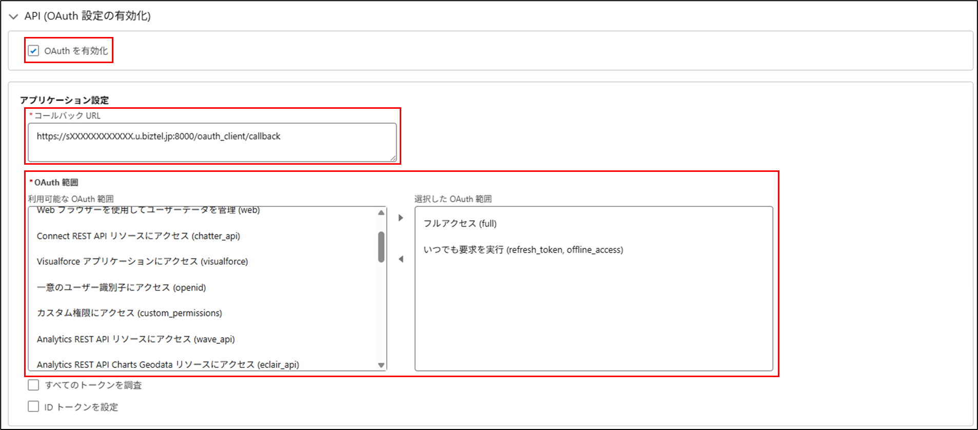 コールバックURL https://sXXXXXXXXXXXX.u.biztel.jp:8000/oauth_client/callback ※赤字部分はご利用中のBIZTEL管理画面のURLに置き換えてください。 OAuth範囲設定 以下を選択したOAuth範囲に設定します。 ・フルアクセス(full) ・いつでも要求を実行(refresh_token,offline_access) |